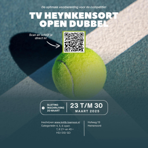 Van 23 tot en met 30 maart 2025 wordt Heinenoord hét toneel van een week vol tennisplezier en gezelligheid! Doe mee aan een van de leukste tennistoernooien in de regio Hoeksche Waard: het Open Dubbel Toernooi TV Heynkensort.